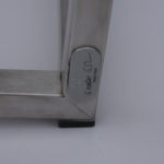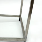DESCRIPTION: Table » Déstabilisation N°1 » à piètement en métal brossé et plateau carré en dalle de verre.