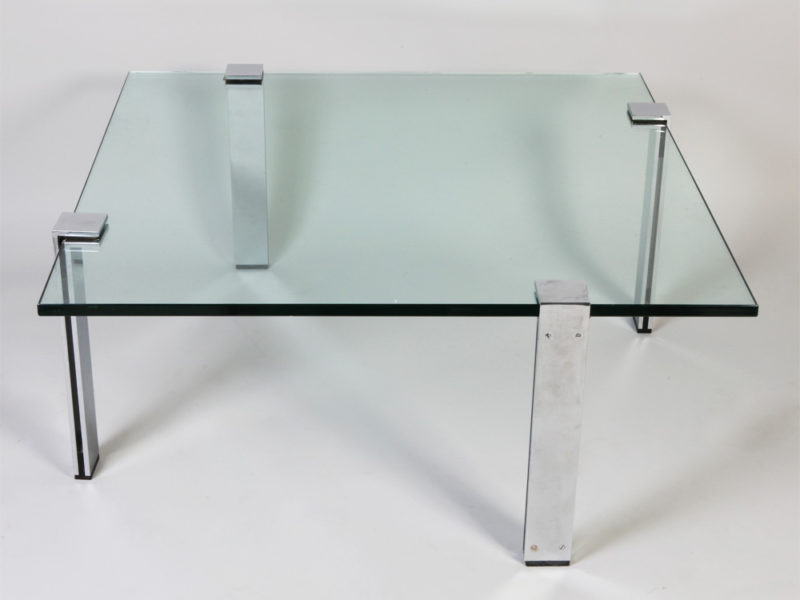 le piètement en métal chromé, le plateau rectangulaire en verre.
