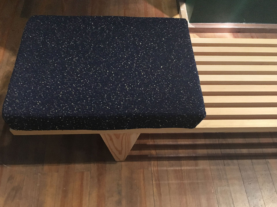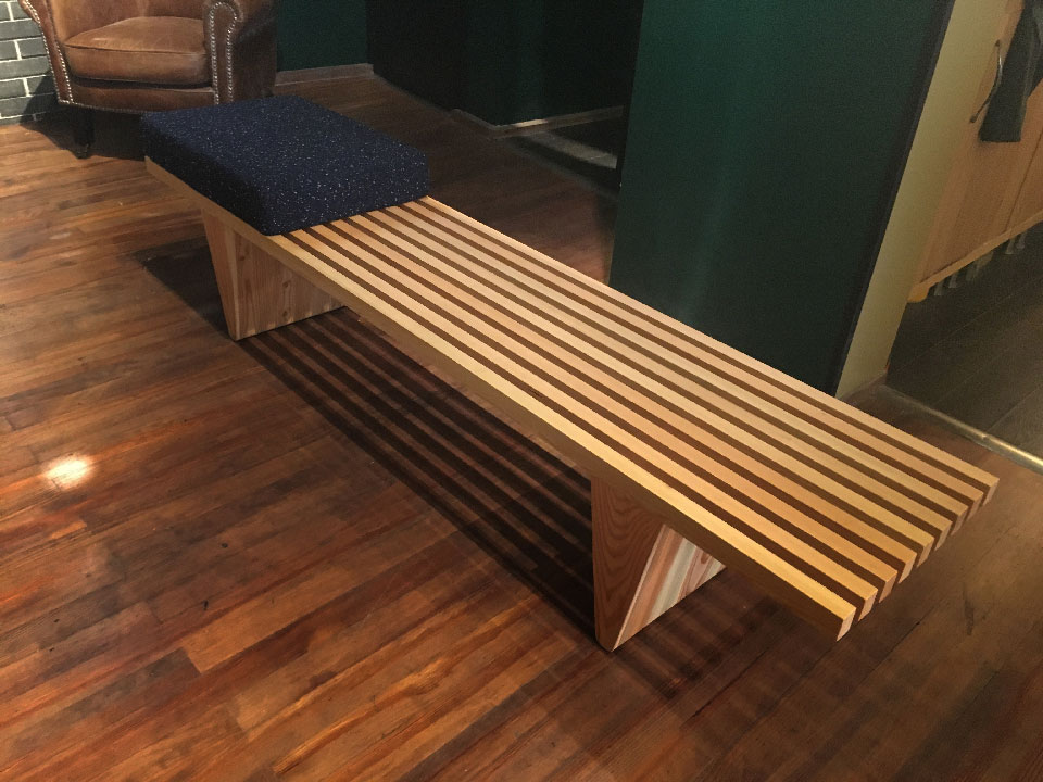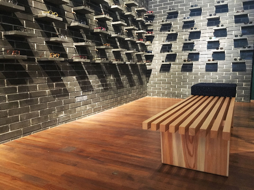 Création d’un mur de brique noires pour l’exposition des lunettes et d’un banc mélèze.