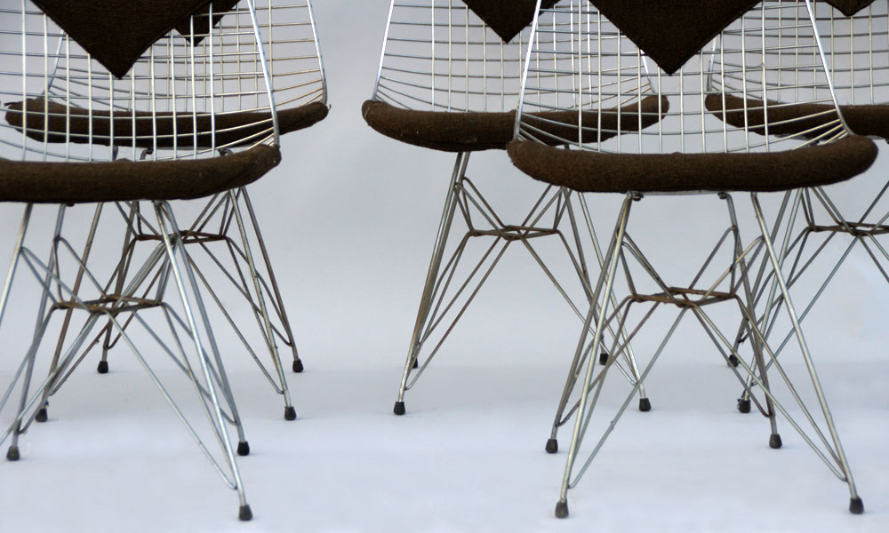 Série de 6 chaises bikini, piètement tour eiffel, assise en treillis métallique, housses en drap de laine marron chocolat pour l’assise et le dossier, circa 1960