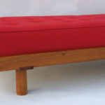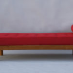 DESCRIPTION: Lit de repos à bâti en orme reposant sur quatre pieds de type rondin. L’assise est un matelas recouvert d’un drap de lin rouge, circa 1960.