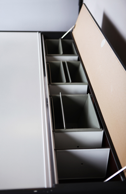 Plateau en bois, piètement en fonte d’aluminium, caisson de rangement sous panneau gainé de cuir noir /