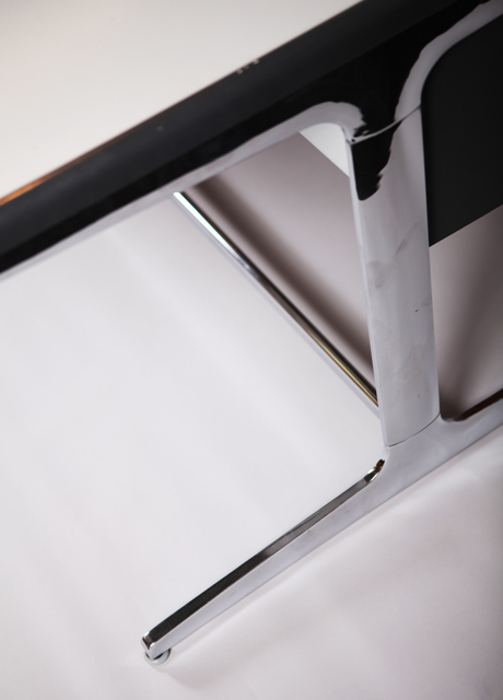 Wooden top, alloyed aluminum feet, storage case under a panel sheathed with black leather