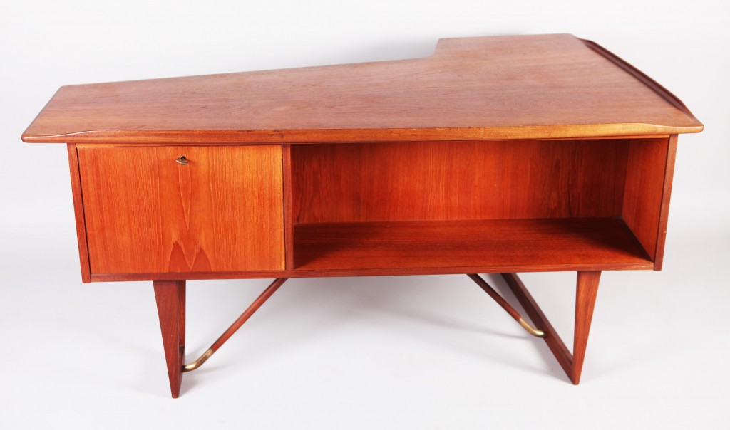 One-box, teak « boomerang »-shaped desk w/ three front drawers and lockable drop top, « u » shaped feet and angle braces w/ brass ends.
