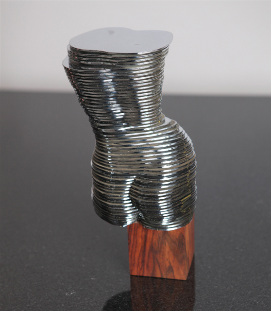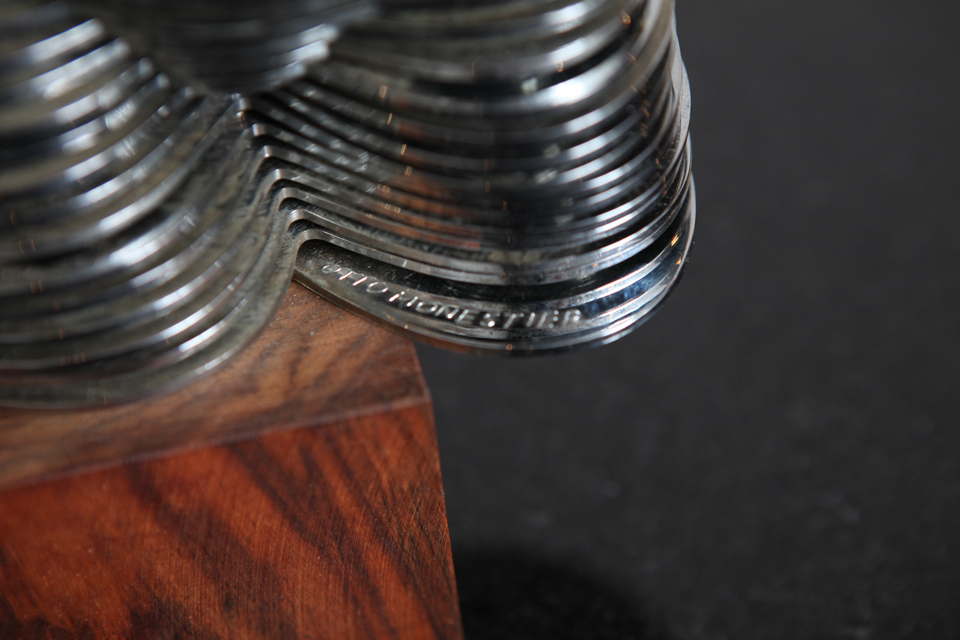 DESCRIPTION: « Eva » segmented torso, metallic composition, signed « Otto Monestier », on wood base. The sculpture is a woman’s torso made up of metallic layers which appear to be chrome on plastic. All of the individual layers pivot on a metal rod which comes up through the layers, and each can be individually moved to form a completely abstract look. The base is veriegated Italian marble. The bottom layer bears the name of the artist.
