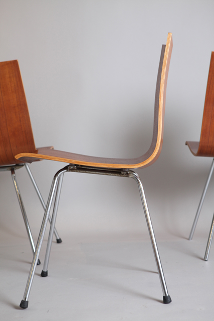 DESCRIPTION: 5 teck chairs name GA two plywood shells, assembled in the middle by metal fixtures, black lacquered feet.