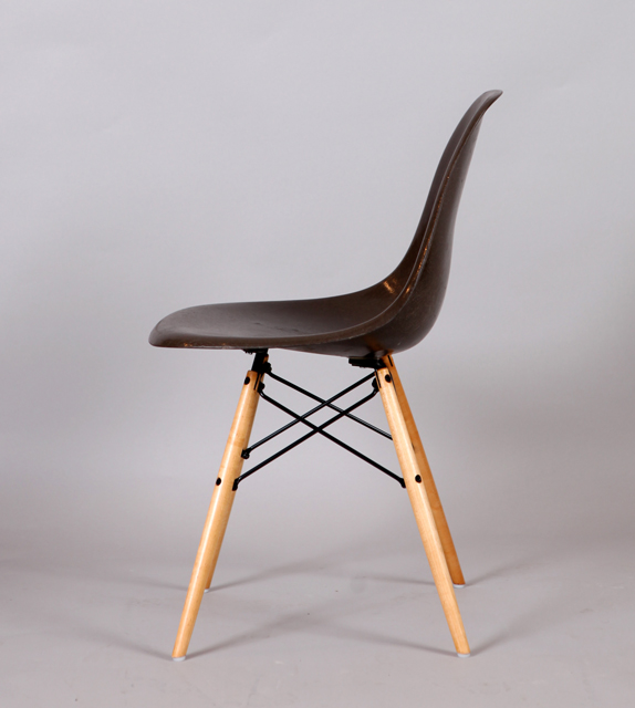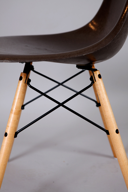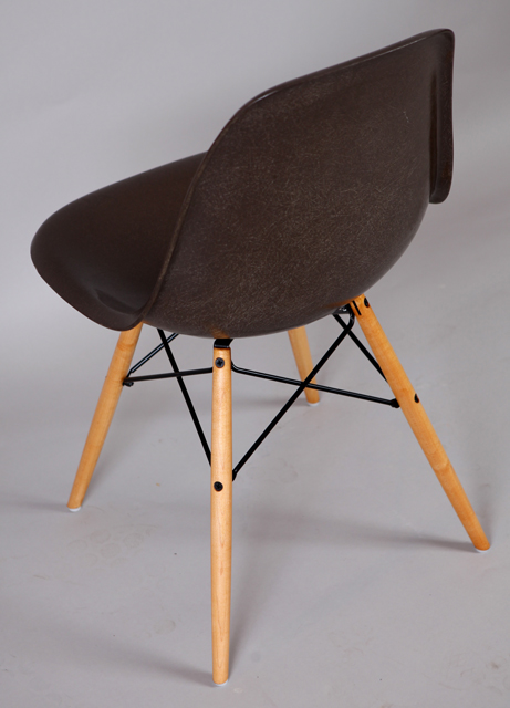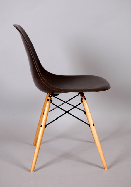 DESCRIPTION: Chaise DSW, coque en polyester teinté chocolat Moka renforcé de fibre de verre, piètement dowel en fil de métal et bois massif tourné en noyer ou en pommier. Embossée sous l’assise Herman Miller.